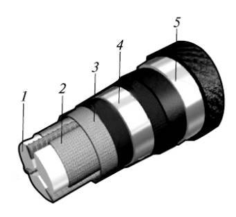 Рис. Силовой кабель: 1 — токопроводящие жилы; 2 — фазная изоляция; 3 — поясная изоляция; 4 — оболочка; 5 — броня